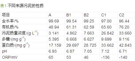 選取了5種不同來源的污泥:曝氣池污泥A采自上海華東理工大學污水處理站,該處理站采用SBR工藝,在曝氣階段取樣;二沉池污泥B1、B2分別采自上海松江某污水處理廠、上海徐匯某污水處理廠,兩處理廠均為A/A/O工藝;濃縮池污泥C1、C2同樣采自上述兩污水處理廠。不同來源污泥的性質見表 1。