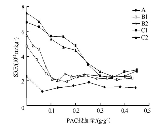 有研究表明SRF比CST能更靈敏地反映污泥性質的變化,且不受污泥濃度的影響〔8, 9〕。因此筆者以 SRF為依據,確定污泥的PAC最優投加量,試驗結果見圖 1。