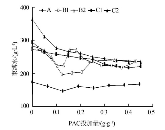 根據F. Colin的方法將污泥中的水分成兩大類:自由水和束縛水。其中自由水可部分或全部被后續機械脫水裝置脫除,而束縛水因與污泥顆粒間存在化學鍵力、物理吸附、毛細管凝結等相互作用,不能被機械脫除,束縛水含量可視為機械脫水的上限〔10〕。在化學調理前,曝氣池污泥A的束縛水含量較低,二沉池污泥(B1、B2)的束縛水含量是污泥A的1.5~1.6倍,濃縮池污泥(C1、C2)的束縛水含量較高,是污泥A的1.7~2.1倍。考察污泥束縛水含量隨PAC投加量的變化情況,見圖 2。