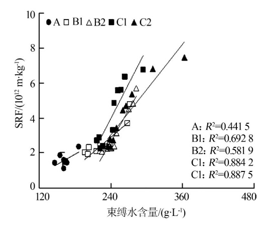 由圖 2可見,不同來源污泥的束縛水含量均隨PAC投加量的增加而下降,降至最低值后又隨PAC劑量的增加而上升。這是因為PAC能夠通過壓縮雙電層、高分子架橋、凝聚網捕等作用使污泥顆粒相互凝聚,改變了污泥中水分的存在形式,使得一部分束縛水轉變成自由水,導致污泥束縛水含量下降;但繼續投加PAC,絮體顆粒會吸附過多的鋁離子,重新使顆粒表面帶上正電荷,顆粒表面與水分子的作用力增強〔11〕,同時過多的PAC還會包圍在絮體顆粒表面,使水分難以釋放出來。對SRF與對應的束縛水含量作圖,并進行線性相關性分析,如圖 3所示。