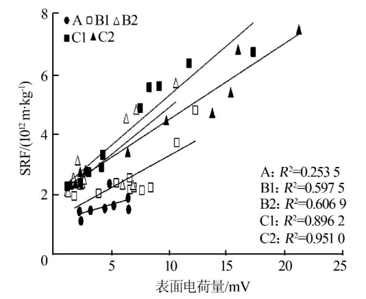 由圖 4可見,不同來源污泥的ZP均隨PAC投加量的增加而上升,污泥顆粒表面從負電性逐漸轉變為正電性。當PAC劑量達到一定值時,ZP變為0,即處于電中性狀態,顆粒之間受范德華引力作用而聚結沉降。其中污泥A、B1、B2的ZP在越過零電位后,出現先升高而后下降的現象。如曝氣池污泥A在PAC劑量為0.095 g/g時,ZP由最初的-4.92 mV升至零電位,之后ZP繼續上升,在PAC為0.318 g/g時達到6.57 mV,但再增加PAC劑量ZP反而下降。出現這種現象是因為隨著溶液中離子強度的增大,顆粒雙電層被壓縮,ZP增大;如果PAC投加量過多,會造成膠粒電性反逆而出現再穩〔12〕。將SRF與對應的顆粒表面電荷量作圖,并進行線性相關性分析。圖 5為污泥顆粒表面電荷量與SRF的相關性。