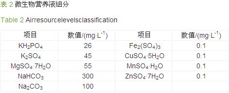 微生物在中空纖維膜表面生長和繁殖需要大量有機和無機養料,在生物膜形成和生長的不同階段,有機養料可由ADB350M菌種激活液和橡膠廢水提供,而無機養料則需要人為加入。為了給MABR的微生物提供全面的營養,供其快速生長繁殖形成生物膜,配制了適合該菌群的營養液,其組分如表 2所示。
