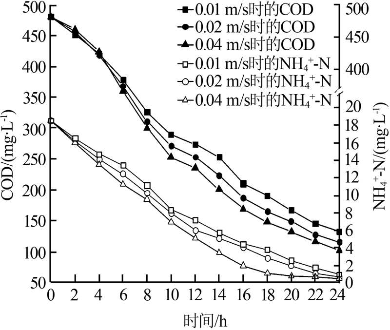 圖5表明,隨著料液流速的提高,COD和NH4+-N的去除率得到不同程度的提高。料液流速為0.04m/s時,COD和NH4+-N的質量濃度分別降至102、0.4 mg/L,其去除率分別達到78.7%、97.8%。
