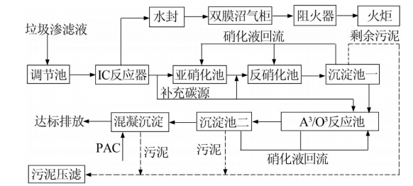 設計出水指標達到《污水綜合排放標準》(GB 8978—1997)三級標準:COD≤500 mg/L、BOD5≤300 mg/L、氨氮≤35 mg/L、SS≤400 mg/L。從垃圾焚燒廠的水質特征及經濟性考慮,采用IC厭氧反應器—短程硝化反硝化—A3/O3生物處理為主體工藝。生活垃圾堆積過程中產生的滲濾液經集液管進入沉淀池,去除部分大顆粒有機物和無機物,經過預沉淀后的廢水流入調節池,池內設置液壓攪拌裝置,調節水質水量后,通過水泵提升至IC厭氧反應器,再進入短程硝化反硝化反應池和A3/O3好氧池,最后經過沉淀池及混凝處理后排放。沉淀池、厭氧反應器和好氧池的剩余污泥排至污泥濃縮池,壓濾后送入垃圾焚燒廠進行焚燒處理。處理工藝流程如圖 1所示。