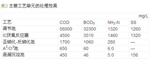 IC厭氧反應器、亞硝化-反硝化池和A3/O3池是利用厭氧微生物、好氧微生物降解COD、氨氮的生物反應過程,這3個單元的優化組合是整個工藝穩定運行的關鍵。經過1 a的運行,結果表明該工藝十分平穩,各設計單元達到預期的處理效果,出水水質均達到設計要求,處理效果如表 2、表 3所示。