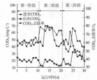 在試驗階段 ,采集河水因漲水 、 下雨 、 河流上游排污情況等而使原水水質呈現一定波動性,原水進水平均 CODCr 為 48.18 mg/L,屬于 《地表水環境質量標準》(GB 3838—2002) 中劣Ⅴ 類。 以原水采取連續進水的方式,分 3 階段運行,每階段均考察馴化穩定后處理效果,不同階段 CODCr 的去除效果見圖 2。