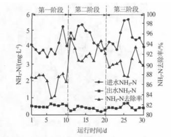 第一階段,氨氮去除率 83.2%~88.1%,出水氨氮質量濃度 0.44~0.65 mg/L,平均 0.53 mg/L,接近Ⅱ 類水 ; 第二階段 ,氨氮去除率 90.6%~95.3%,出水氨氮質量濃度 0.20~0.50 mg/L,平均 0.35 mg/L,Ⅱ 類水 ;第三階段,氨氮去除率 87.6%~93.4%,出水氨氮質量濃度 0.29~0.70 mg/L,平均 0.46 mg/L,Ⅱ 類水 。 三個階段,氨氮去除率都較為穩定且總體出水穩定 ,第二階段氨氮去除率和出水水質略高于其他兩個階段。