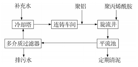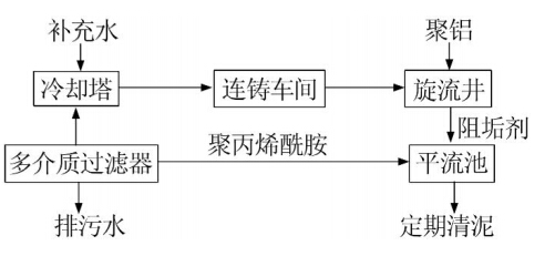 循環水進入旋流井,與聚鋁混合作用后去除氧化鐵皮,出水進入平流池,經絮凝、沉淀、過濾后出水上冷卻塔循環使用。處理工藝采用平流池作為沉降設備來去除懸浮物,同時在平流池上安裝除油機以除去浮油,延長后續過濾器濾料的使用壽命。由于循環冷卻水回水水質較差,而供水水質要求較高,該流程中過濾器的壓力較大,需要定期檢查濾料并及時補充,以保證出水水質。