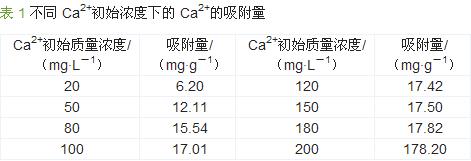 由表1可見,隨著Ca2+初始質量濃度的升高,吸附劑對Ca2+的吸附容量增大,Ca2+初始質量濃度低于110mg/L時吸附劑對Ca2+的吸附容量增大迅速,當水樣中Ca2+初始質量濃度超過110mg/L時吸附劑對Ca2+的吸附容量增大的速率變緩;當Ca2+初始質量濃度達到200mg/L時,吸附容量達到最大值17.8mg/g。這是因為隨著水樣中Ca2+的增加,吸附的Ca2+增多使吸附劑很快達到飽和,無法繼續吸附水樣中其余的Ca2+致使吸附容量無法繼續增加。