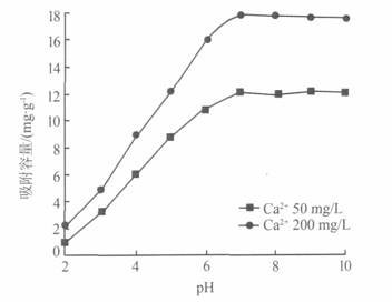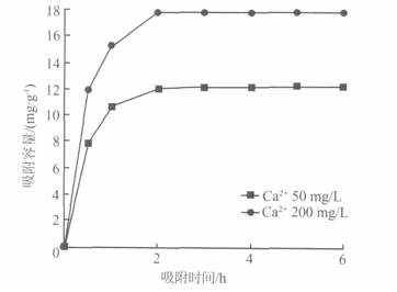 根據實際應用中反滲透進出水的Ca2+濃度,選取Ca2+質量濃度分別為50mg/L和200mg/L的兩種水樣對其吸附條件進行考察。
