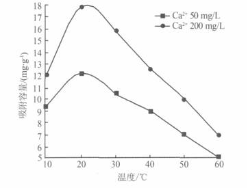 在不同溫度下用改性廢分子篩對Ca2+質量濃度分別為50、200mg/L的水樣進行吸附實驗,以恒溫水浴保溫,振蕩吸附2h,吸附劑投加量為1.0g/L,實驗結果見圖3。