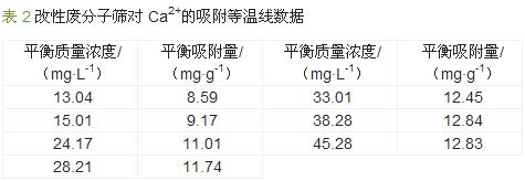 取改性廢分子篩0.1g置于100mL不同Ca2+濃度的水樣中,在20℃下于恒溫水浴搖床中震蕩2h,使吸附達到平衡,測定水樣中Ca2+濃度,計算出平衡吸附容量,得出的平衡吸附數據見表2。具體參見http://www.bnynw.com更多相關技術文檔。