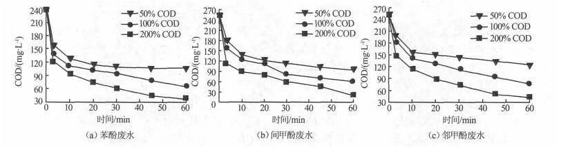不同F(xiàn)enton試劑投加量下處理3種廢水的試驗結(jié)果如圖1所示。從圖1可以看出,不同F(xiàn)enton試劑投加量對3種酚類廢水均有一定的處理效果,且Fenton試劑的投加量大小對處理效果有較大影響,投加量越高,COD去除率越高。在維持n(H2O2)∶n(Fe2+)=15∶1不變的條件下,當(dāng)投加可氧化掉廢水50%COD的H2O2理論投加量時,苯酚、間甲酚和鄰甲酚廢水中的COD在60min內(nèi)可分別由238.3、251.9、251.9mg/L降到106.3、94.3、125.9mg/L;而當(dāng)投加可氧化掉廢水200%COD的H2O2理論投加量時,苯酚、間甲酚和鄰甲酚廢水中的COD在60min內(nèi)可分別降低到37.1、22.4、41.4mg/L。研究表明,H2O2是影響Fenton氧化反應(yīng)的主要因素,體系中H2O2作為反應(yīng)中的氧化劑,投加量較小時,•OH產(chǎn)生的數(shù)量相對較少;同時H2O2又是•OH的捕捉劑,H2O2投加過量時會捕捉新生成的•OH從而造成淬滅。因此當(dāng)Fenton試劑的理論投加量從可氧化掉50%的COD增加到可氧化掉100%和200%的COD時,COD的去除率并未出現(xiàn)線性增加,其增加幅度逐漸變緩。