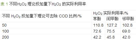 (1)Fenton氧化法對含苯酚、間甲酚和鄰甲酚廢水均具有較高的處理效果,H2O2投加量對含酚廢水的處理效果有很大影響,其直接影響廢水中污染物的降解程度。但過量投加H2O2,H2O2利用率并不高,造成H2O2大量浪費。