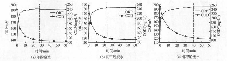 在Fenton試劑投加量理論上可氧化掉廢水中50%的COD時,3種含酚廢水的ORP和COD隨時間的變化如圖2所示。