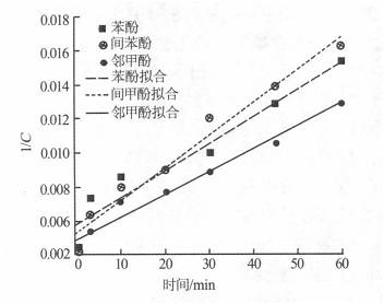 (3)Fenton氧化處理苯酚、間甲酚、鄰甲酚廢水均符合二級動力學(xué)模式,其氧化速率順序為間甲酚>苯酚>鄰甲酚。