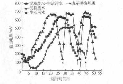 由圖1可知,當利用混合菌源接種時,反應器運行19d,輸出電壓基本穩定在660mV,即完成啟動;而接種淀粉廢水和生活污水的MFC,反應器分別運行27d和26d時,輸出電壓基本穩定在510mV和630mV,即完成啟動。試驗結果表明,前者較后兩者啟動時間分別縮短了29.6%和26.9%,而且穩定時的輸出電壓也較高。