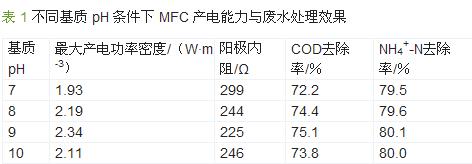 試驗去掉陽極緩沖體系,并以1mol/L的NaOH調節陽極基質pH。為防止堿的加入引起基質離子強度的改變,通過NaCl調節溶液離子強度,以確保離子強度相等。不同基質pH條件下MFC的產電能力與廢水處理效果如表1所示。