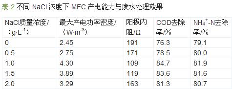 本研究變換陽極基質NaCl的濃度,對MFC基質離子強度進行優化。不同NaCl濃度下MFC的產電能力與廢水處理效果如表2所示。