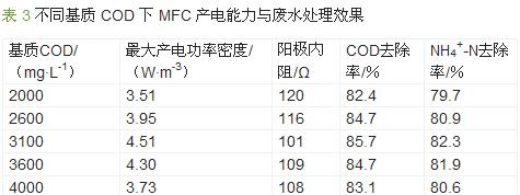 由表3可知,隨著基質COD的增加,MFC的產電能力先增大后減小,當COD為3100mg/L時,MFC的產電能力最大。出現此變化趨勢的原因可能是:在一定COD范圍內,隨著基質COD的增加,微生物獲得更多的營養物質,加速了微生物降解底物、產生電子的速率,從而提高了MFC的產電能力。同時,淀粉為高分子化合物,溶解于水后容易形成膠體,淀粉濃度越高,膠體量越多,而膠體表面往往帶有一定量的電荷,可能影響了電子、質子的傳遞,從而影響了微生物的產電能力;過多的淀粉投加量也可能產生了過多的不利于微生物生長代謝的中間產物,影響微生物產電。