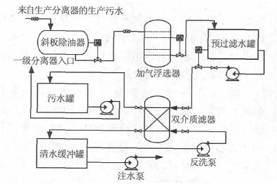 污水處理系統(見圖1)采用斜板隔油分離、浮選和過濾3級處理。第1級為4臺處理能力為500m3/h的斜板隔油器,對來自生產分離器的生產污水進行初步分離,除去污水中粒徑較大的浮油;第2級為4臺處理能力為500m3/h的氣體浮選器,除去污水中大多數粒徑﹥10μm的油滴;第3級為16臺處理能力為150m3/h的雙介質過濾器,進一步除油,同時去除水中的懸浮物使之達到注水水質標準。