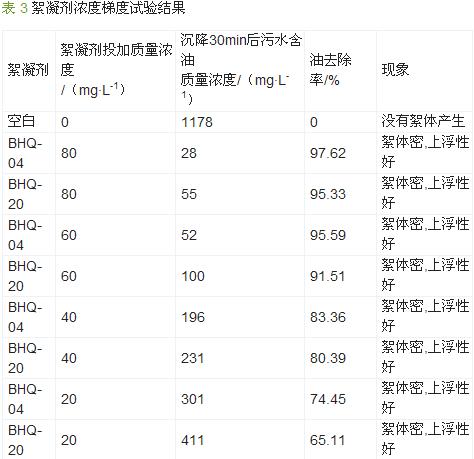由表4可知,現場注入60mg/LBHQ-04就可以達到注入170mg/LBHQ-10時的效果,大大降低了藥劑用量,解決了冬季海上運輸難題,使處理出水達到注水水質標準。絮凝劑BHQ-04的開發使含聚污水的處理由無機類絮凝劑轉向高分子有機類絮凝劑。