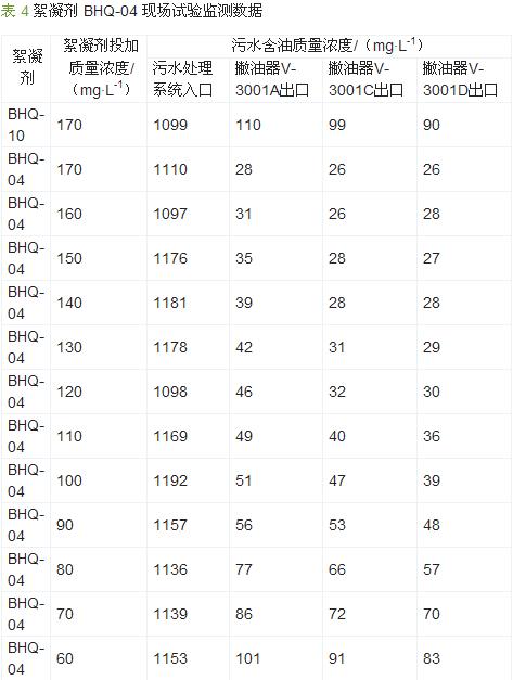 現場試驗期間取污水處理系統一級處理器撇油器入口及出口處的水樣,監測其含油量的變化,以確認絮凝劑BHQ-04的處理效果,F場試驗監測數據見表4。具體參見http://www.bnynw.com更多相關技術文檔。