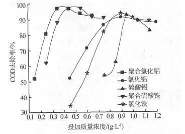 實驗選取5種無機混凝劑,其中鋁鹽混凝劑包括硫酸鋁、氯化鋁和聚合氯化鋁(PAC);鐵鹽混凝劑包括三氯化鐵和聚合硫酸鐵(PFS)。對每種混凝劑均進行投加量和pH的實驗:(1)取200mL實驗廢水,在相同的pH和攪拌速度下,加入不同量的混凝劑進行實驗,篩選出混凝劑的最佳投加量;(2)取200mL實驗廢水,調節水樣pH,在相同的混凝劑投加量和攪拌速度下進行實驗,篩選出最佳pH。并最終篩選出最佳混凝劑。