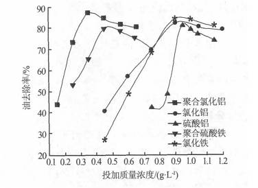 水樣pH對處理效果的影響實驗結果表明,5種混凝劑的最適pH都在7左右,pH過大或過小都會降低污染物的去除率,其中鐵鹽混凝劑的pH適用范圍明顯比鋁鹽混凝劑要大。此外,在最適pH下,5種混凝劑對COD和油的去除效果都很好,其中處理效果最好的是聚合氯化鋁,在pH為7左右時,COD、油去除率分別達到96.6%、85.5%。因原水pH為6.8,考慮到經濟因素,在后續實驗中不對水樣進行pH調整。