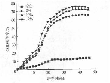 比較菌種投加量為10%和12%的數據可以看出,當其投加量增加到一定程度后,污染物去除率的增大并不明顯,這是因為當微生物的初始投加量增大一定程度之后,最終可以在廢水中生長的數量會達到一個最大值,此后繼續增大初始投加量,并不能繼續擴大菌群數量。選擇12%為微生物的最佳初始投加量。