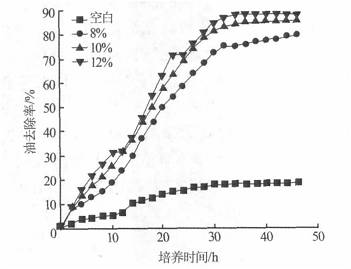 在菌懸液接種量分別為0、8%、10%和12%的條件下,考察了微生物培養時間對處理效果的影響,結果見圖3、圖4。