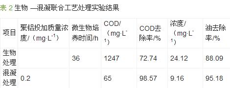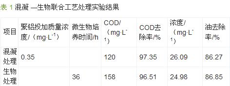 由表1可知,采用混凝—生物聯合工藝處理實驗廢水,雖然混凝階段處理效果理想,COD去除率高達97.35%。但后續微生物處理出水的COD反而升高,這可能是由于混凝出水的COD過低,導致微生物不能正常生長而死亡,致使COD升高;經生物處理后,出水油含量幾乎沒有降低。