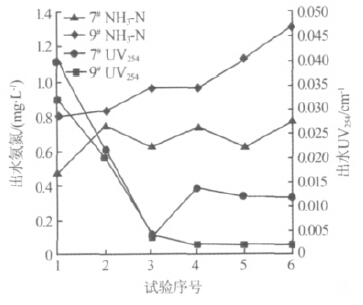 由表6可知,工況7和工況9的綜合指標(biāo)Z值較其他工況要高,分別為58.24和66.53,為備選的較優(yōu)工況。在實(shí)際運(yùn)行過(guò)程中,出水水質(zhì)是檢驗(yàn)工況合理性的最直接和最重要因素,其中出水氨氮和UV254為主要檢測(cè)指標(biāo),工況對(duì)其去除效果和出水穩(wěn)定性的影響最為重要。對(duì)工況7和工況9運(yùn)行過(guò)程中的出水氨氮和UV254進(jìn)行監(jiān)測(cè),見(jiàn)圖3。