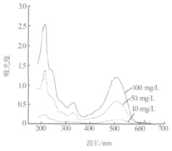 分別對質(zhì)量濃度為10、50、100mg/L的酸性紅B進行吸光度掃描,見圖1。從圖1可以看出,酸性紅B在506nm處具有穩(wěn)定的吸收峰。