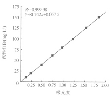 在10~150mg/L范圍內(nèi)配制酸性紅B標(biāo)準(zhǔn)溶液,在λ=506nm處測其吸光度,得到質(zhì)量濃度-吸光度標(biāo)準(zhǔn)曲線,如圖2所示。從圖2可以看出,酸性紅B的質(zhì)量濃度與吸光度呈線性關(guān)系,R2可達0.9999。利用該標(biāo)準(zhǔn)曲線,可通過測定酸性紅B的吸光度來計算酸性紅B的質(zhì)量濃度。