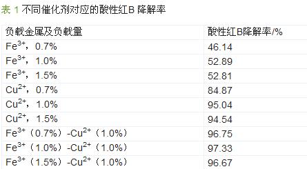 (1)采用微波/催化劑/H2O2降解酸性紅B時,不同負載金屬離子和負載量催化劑的降解效果差異很大。其中Fe3+-Cu2+(質(zhì)量分數(shù)均為1.0%)負載活性炭催化劑的效果最好。
