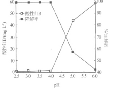 從圖3可見,初始pH對酸性紅B的降解率影響很大,在考察的初始pH范圍內(nèi),反應(yīng)后溶液中酸性紅B在0.95~58.26mg/L之間,對應(yīng)的降解率為99.05%~42.32%,差異顯著。pH在2.5~4時,降解率為98.97%~99.05%,差異較小,但當(dāng)pH>4時酸性紅B的降解率顯著下降;pH達到6時,降解率降到42.32%,可見較高的pH不利于催化反應(yīng)的進行,適宜pH為3。