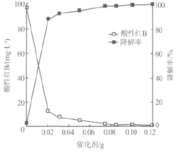 在反應(yīng)液初始pH為3、H2O2用量為0.1mL、微波功率為300W及輻照時間4min的條件下,考察催化劑投加量對降解效果的影響,結(jié)果見圖4。