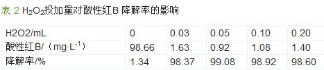 在反應(yīng)液初始pH為3、催化劑投加量為0.1g、微波功率300W及輻照時間4min的條件下考察H2O2投加量對降解效果的影響,結(jié)果見表2。