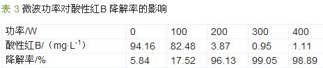 在反應(yīng)液初始pH為3、催化劑投加量為0.1g、H2O2投加量為0.05mL、輻照時間4min的條件下,考察微波功率對降解效果的影響,結(jié)果見表3。