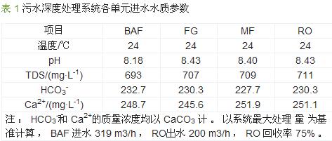 由表2可見,在不存在離子濃縮的條件下,BAF、FG、MF及RO均已存在結垢傾向,RO在離子濃縮后LSI更是高達3.0以上。而目前除反滲透采取了投加阻垢劑的阻垢措施外,其他各單元均沒有采用任何阻垢措施。這也進一步解釋了該污水深度處理系統結垢嚴重的原因。