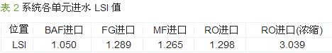 依據表1中系統各單元進水水質參數計算所得系統各單元進水的LSI見表2。
