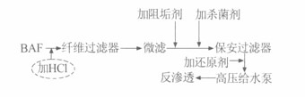 調整后原有流程及操作條件基本保持不變,在BAF出口增加一加酸點,投加HCl,調整pH至6.0~7.5,以防止LSI過大而結垢,而且增加了殺菌劑HClO在保安過濾器進水中的投加量。