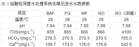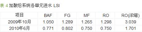 為了進一步驗證加酸后的效果,對比了加酸前后BAF進口、FG進口、MF進口以及RO進口處的LSI,2010年6月深度水處理系統各單元進水水質參數如表3所示。具體參見http://www.bnynw.com更多相關技術文檔。