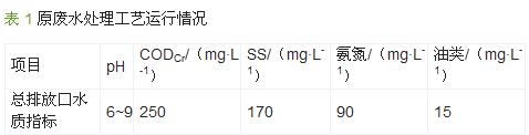 該工藝運(yùn)行初期處理效果較好,基本能達(dá)到《污水綜合排放標(biāo)準(zhǔn)》的三級(jí)標(biāo)準(zhǔn)要求。隨著生產(chǎn)規(guī)模擴(kuò)大及排放標(biāo)準(zhǔn)的提高,現(xiàn)城市污水處理廠(chǎng)不再接納該廠(chǎng)排放污水,該廠(chǎng)排放污水需滿(mǎn)足污水排放標(biāo)準(zhǔn)一級(jí)標(biāo)準(zhǔn),直接排放到附近河流。因此需對(duì)原工藝進(jìn)行技術(shù)改造。原廢水處理工藝運(yùn)行情況如表1所示。