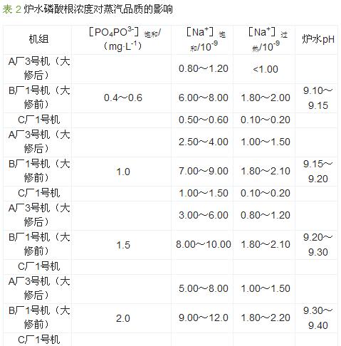 爐水磷酸鹽濃度對蒸汽品質的影響見表2。