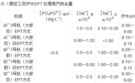 爐水平衡磷酸鹽處理(EPT)對蒸汽品質影響的試驗:將A廠3號機和B廠1號機爐水處理方式由低磷酸鹽處理方式轉為平衡磷酸鹽處理方式,將磷酸根濃度控制在爐水磷酸鹽平衡點濃度以下,適量加入氫氧化鈉以調整爐水pH。機組額定工況運行,重點檢測蒸汽鈉含量、爐水鈉含量、磷酸根含量、pH、電導率等監控指標。