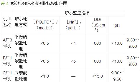 通過上述試驗,為了降低試驗機組飽和蒸汽鈉質量分數,達到小于5×10-9的標準控制要求,確定了各試驗機組鍋爐爐水最優控制指標,見表4。具體參見http://www.bnynw.com更多相關技術文檔。