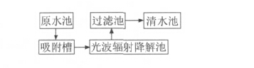 光電子波技術處理工業廢水是根據量子力學原理,在工業廢水中安裝光電子波發生裝置,使廢水中產生大量的光子和電子,在光電子波作用下,大分子的化學鍵斷裂,電荷轉移,被分解成小的無污染的小分子,從而達到凈化污水的效果。鐘林〔21〕采用光電子波技術處理模擬丙烯酸廢水,丙烯酸廢水先經吸附槽吸附回收部分有機物,之后進入裝有若干套光波輻射裝置的光波輻射降解池,在微波輻射和紫外光的作用下有機物發生分子鍵斷裂,分解為CO2及H2O,處理時間6h,出水過濾回收。處理后廢水COD由55g/L降低至0.3g/L左右,BOD由850mg/L降低至20mg/L左右,對其中的丙烯酸和乙酸去除效果明顯。其工藝流程如圖4所示。