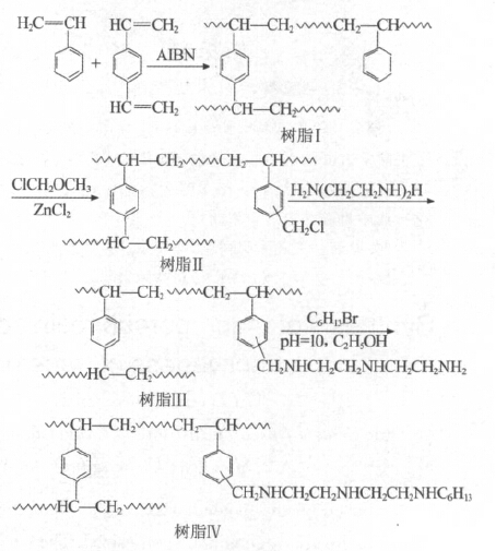 取20g樹脂Ⅲ懸浮于100mL乙醇中(NaOH調pH=10),加入10g溴代正己烷,80℃下反應10h。用抽濾瓶將母液抽出,樹脂依次用乙醇、蒸餾水洗滌,得側鏈含有6個碳的直鏈烷基的樹脂(樹脂Ⅳ)。上述制備過程可用圖1表示。
